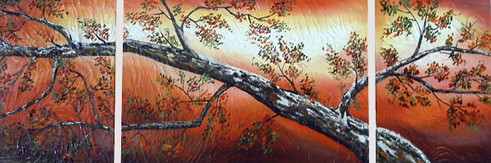 This art work contains of three individual peices deffereent in sizes. Two smaller canvas of 30 in 60 cm and one with 40 in 25 cm. The tecnique is oil color on canvas with hard rexture underneath.